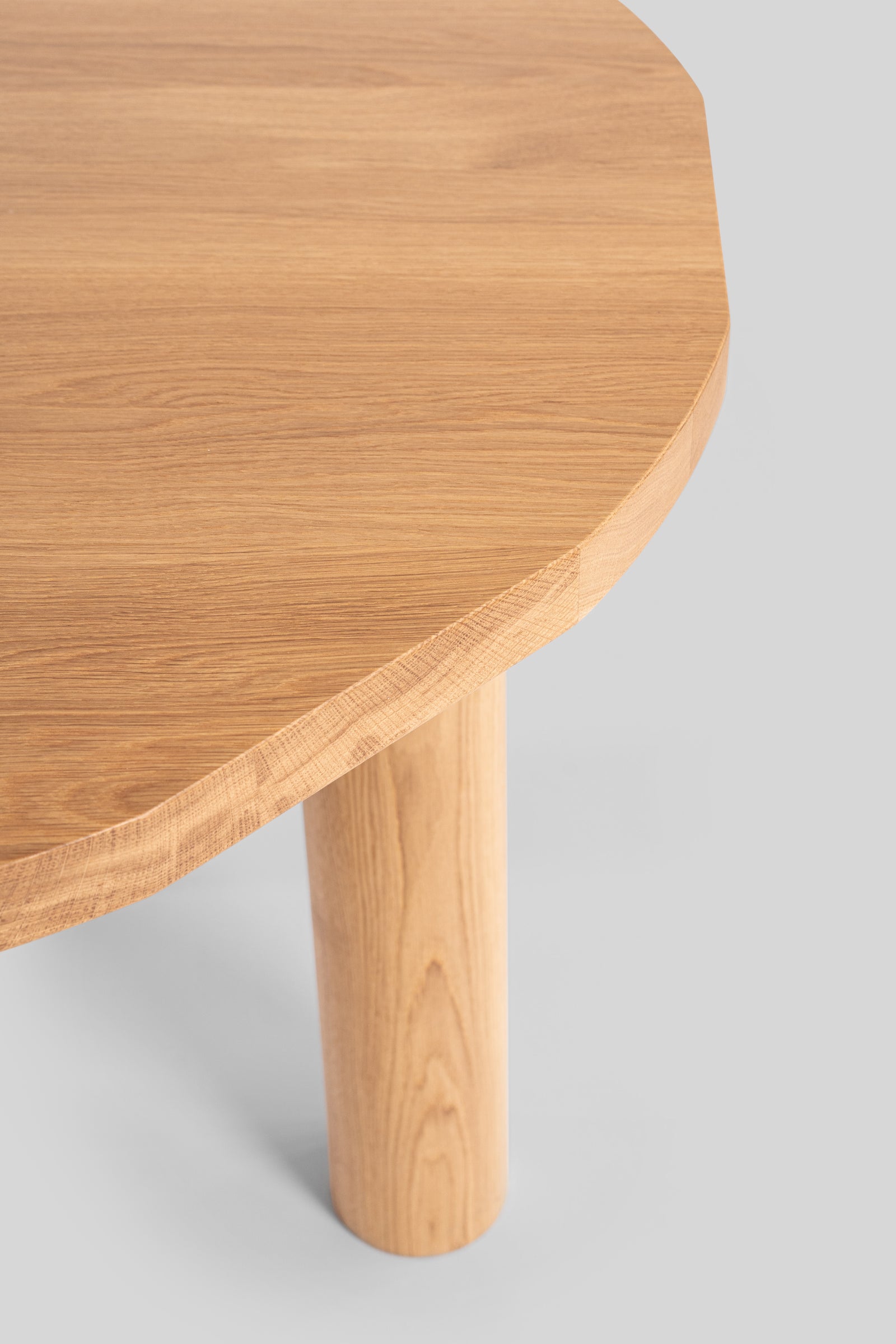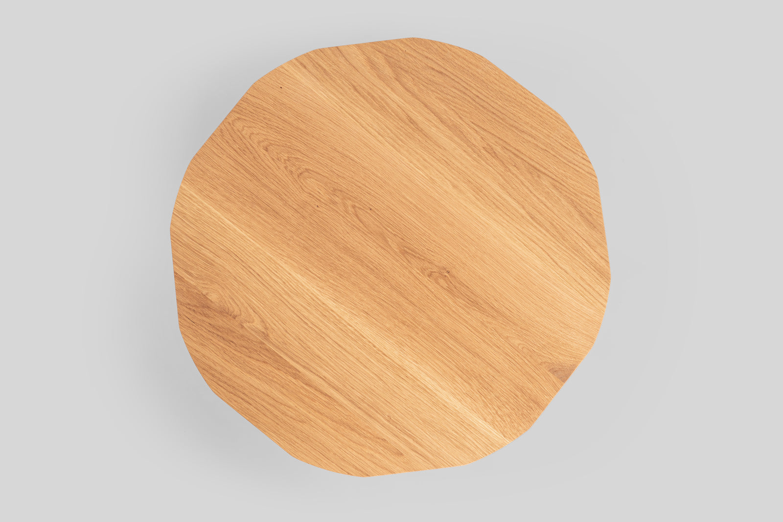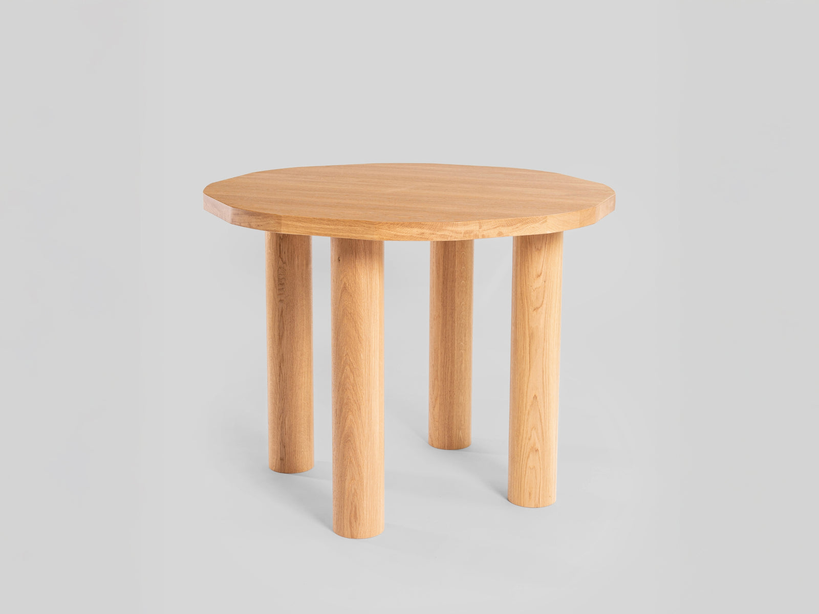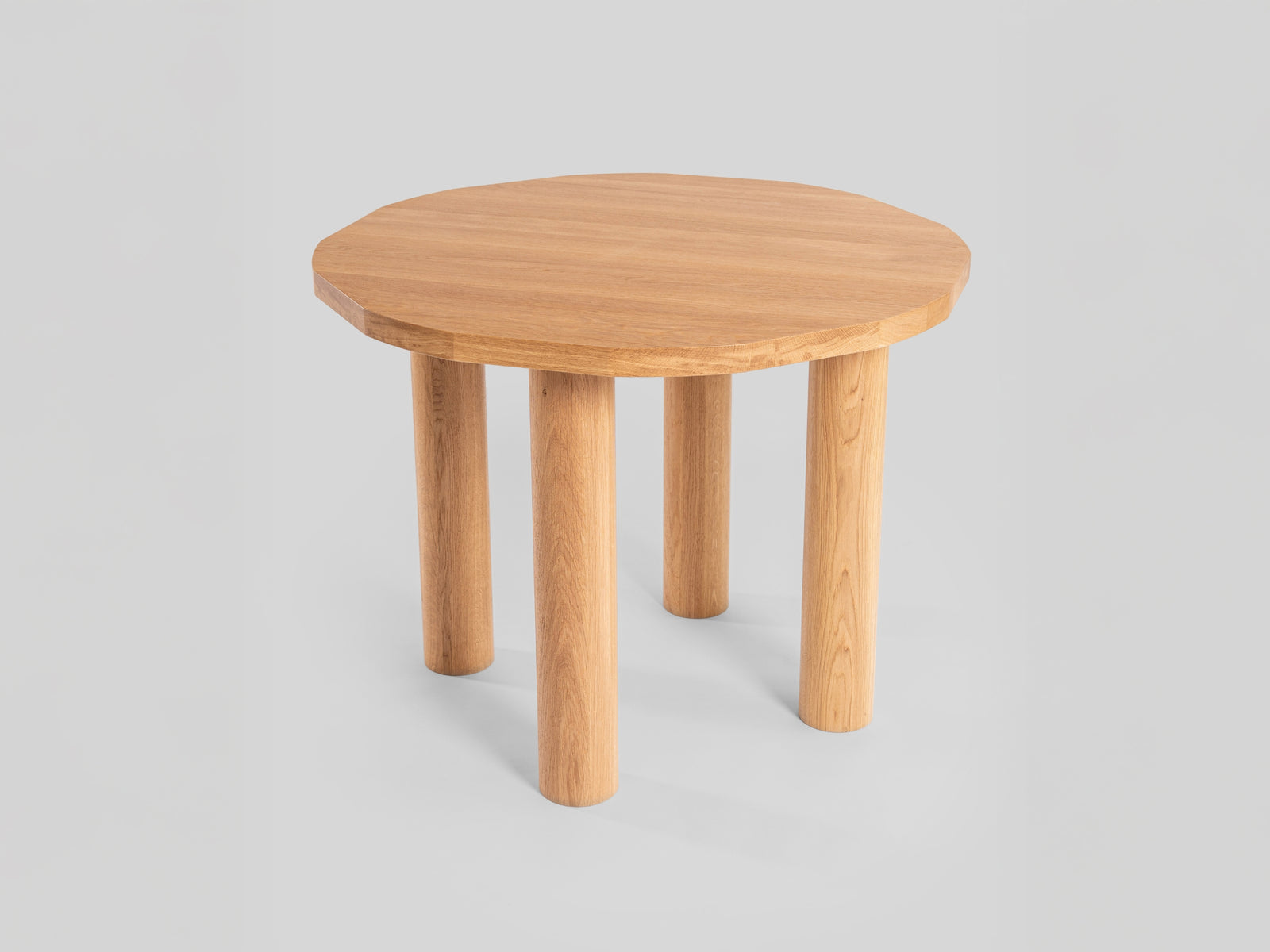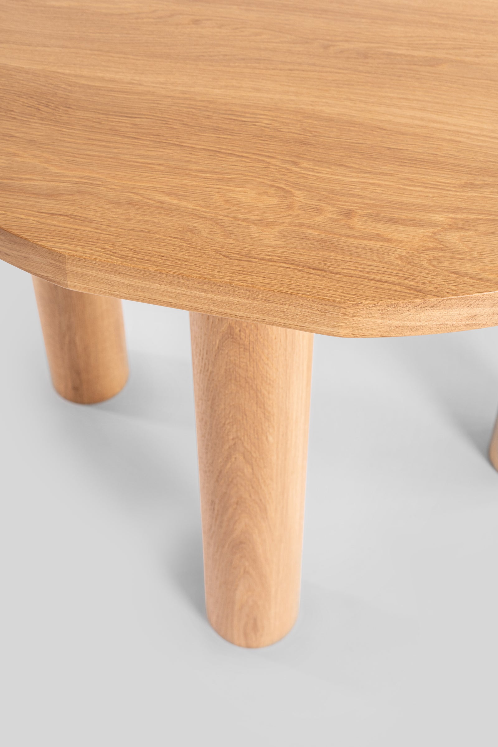 Zaokrąglony, nieregularny blat wspiera się na czterech cylindrycznych nogach, które nadają całości wyważoną lekkość i rytm. To mebel, który nie tylko uzupełnia przestrzeń, lecz sam staje się jej punktem skupienia.