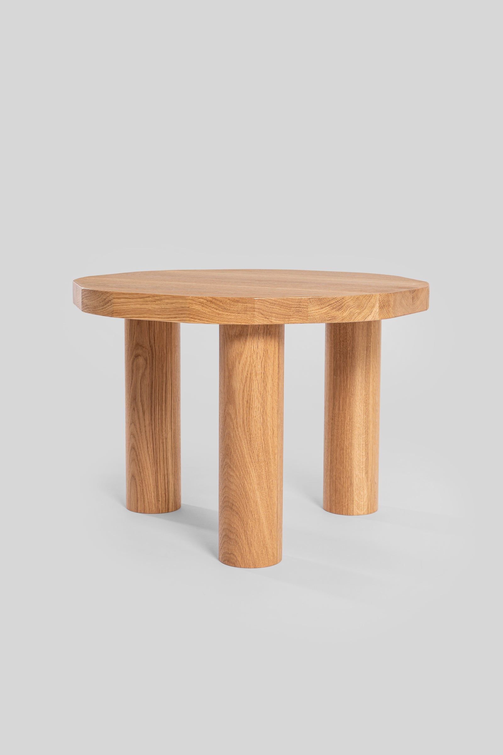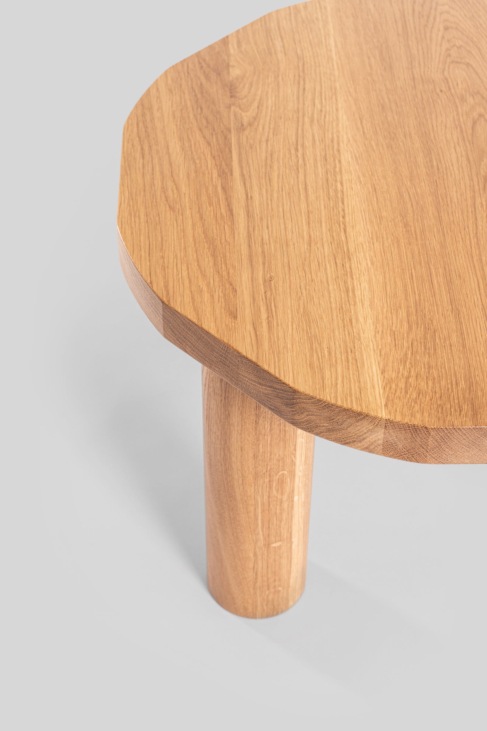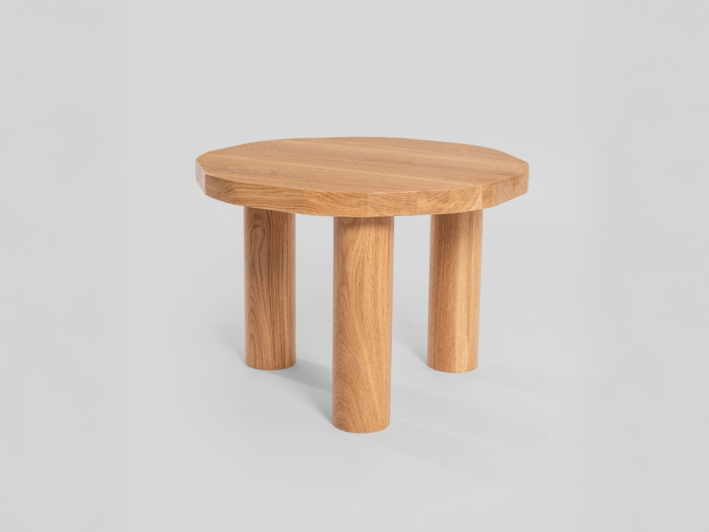 Zaokrąglony, nieregularny blat wspiera się na trzech cylindrycznych nogach, które nadają całości wyważoną lekkość i rytm. To mebel, który nie tylko uzupełnia przestrzeń, lecz sam staje się jej punktem skupienia.
