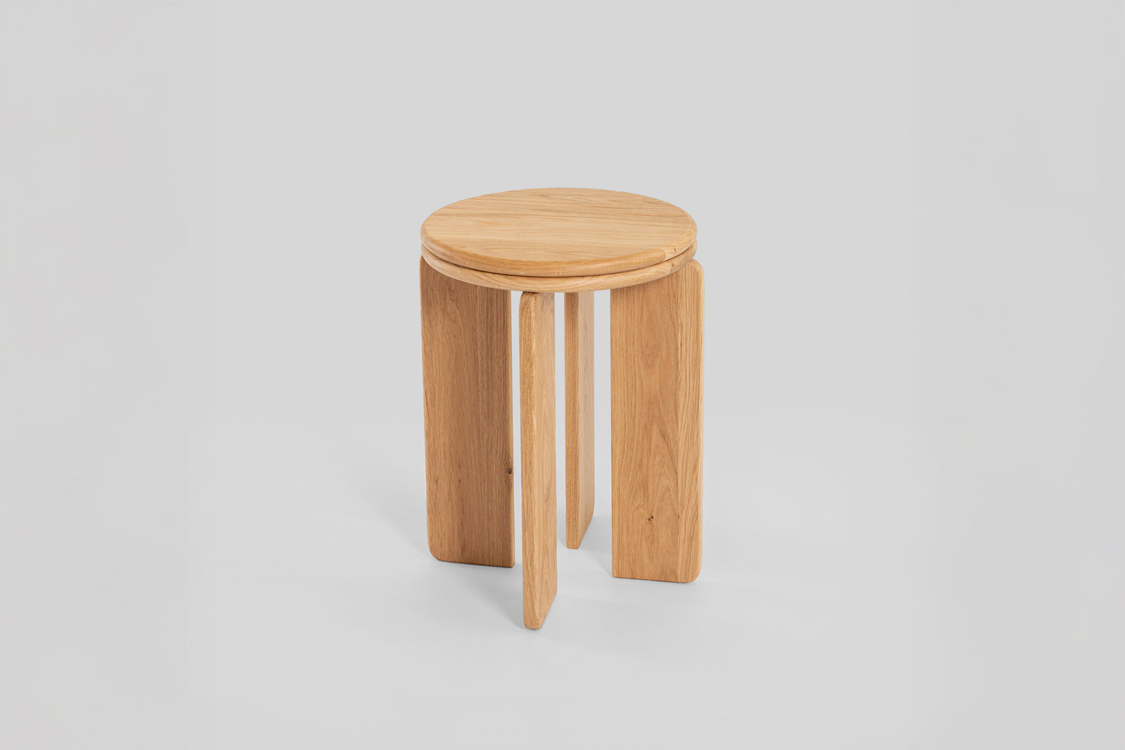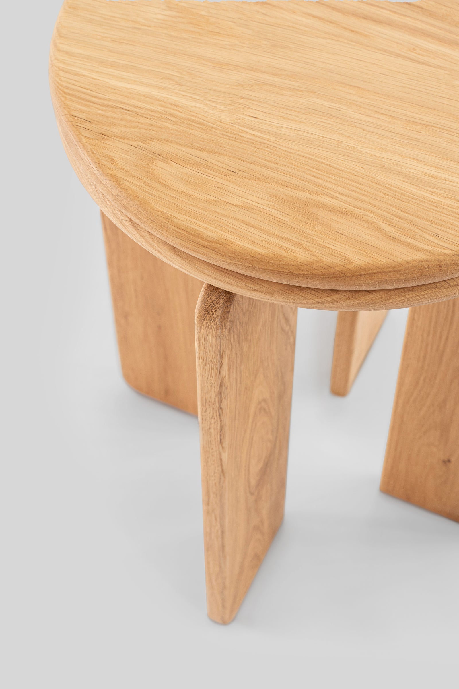 Wykonany w całości z litego drewna dębowego, zachwyca subtelną formą, w której miękkość okrągłego blatu spotyka się ze stabilnością trzech solidnych nóg o delikatnie zaokrąglonych krawędziach.