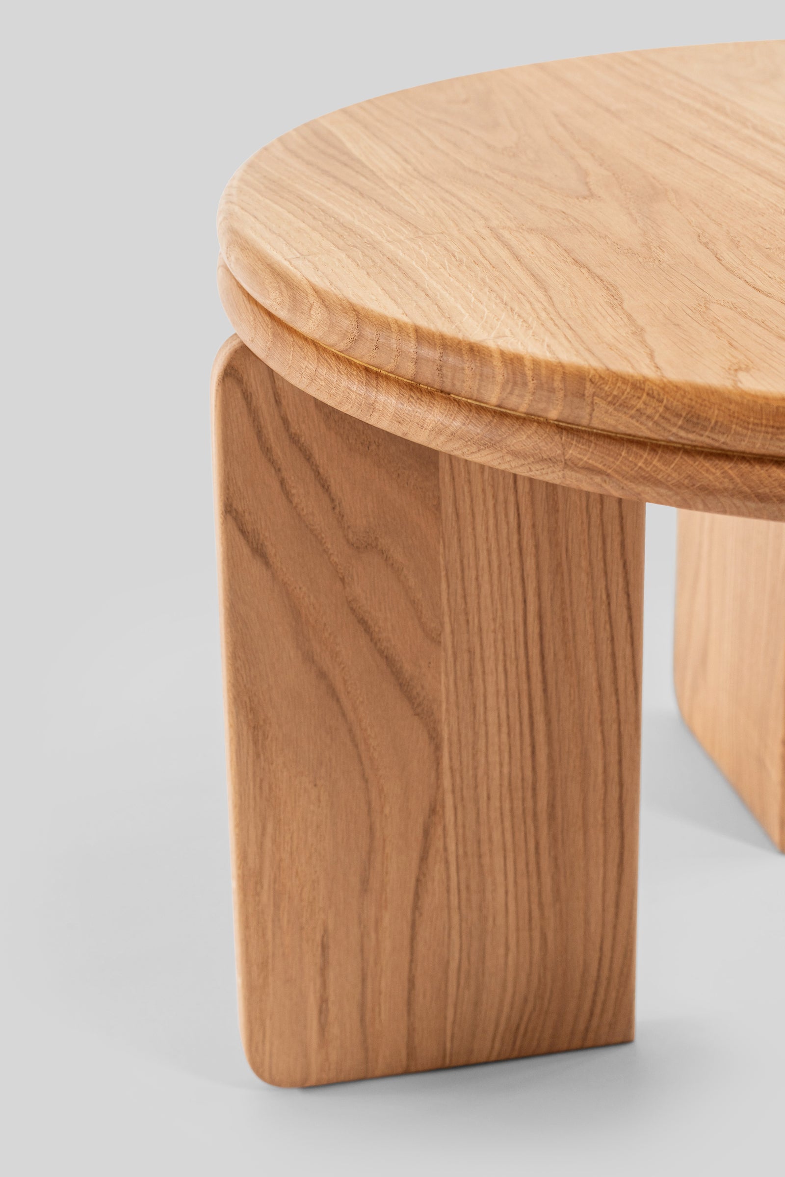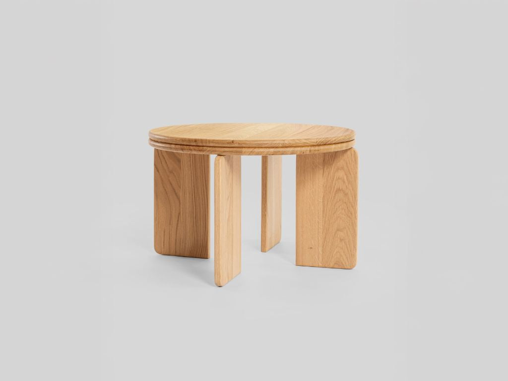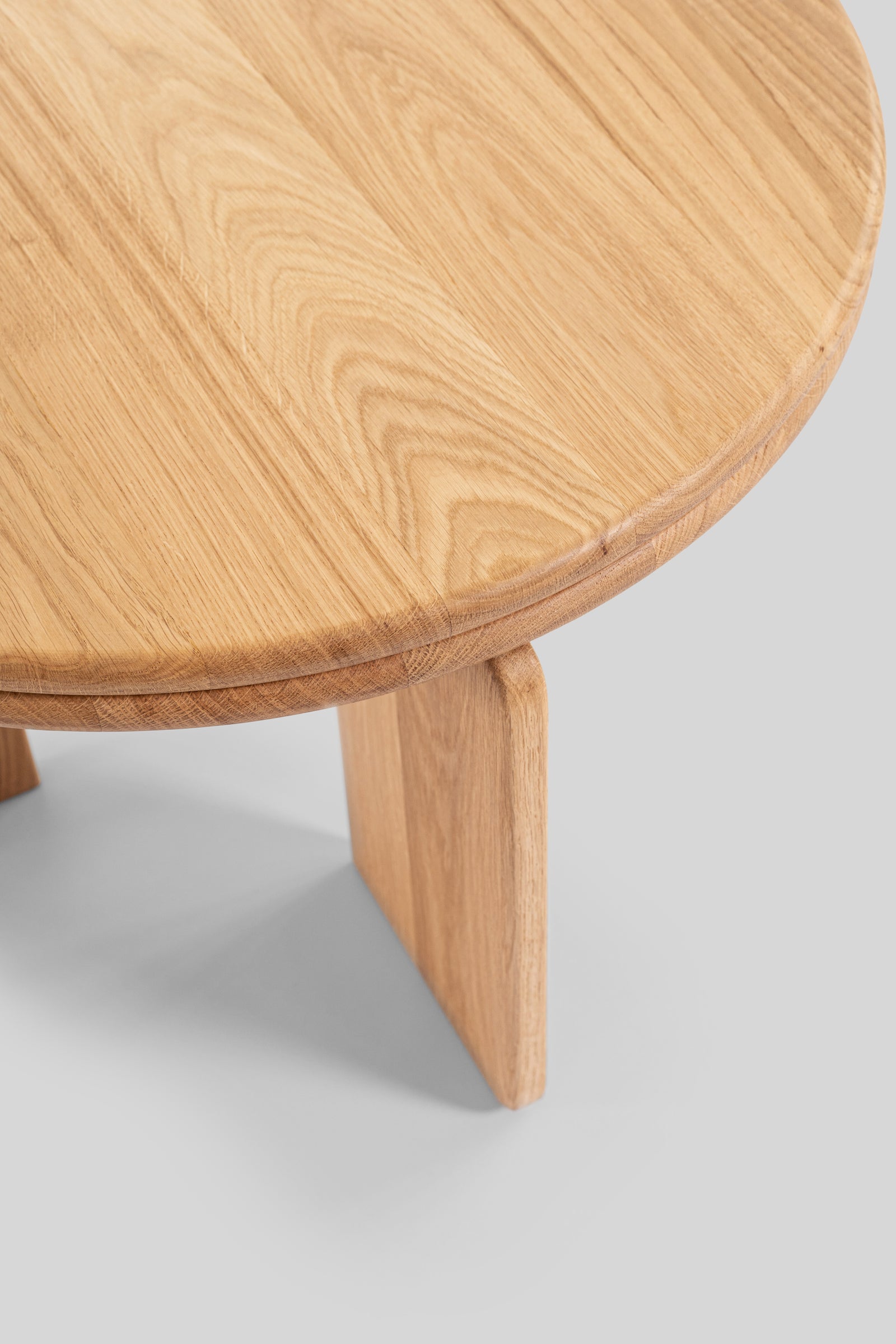 Blat stolika składa się z dwóch połączonych elementów, które tworzą subtelny detal. Zaoblone nogi wspierają całość w sposób lekki i harmonijny, zachowując płynność proporcji. Wykończenie olejowoskiem uwydatnia fakturę drewna i jego ciepły ton, pozostając wierne idei prostoty i trwałości.