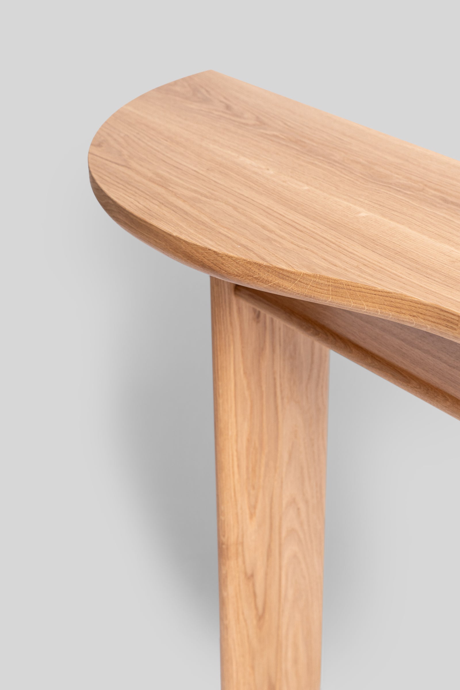 Konsola Onda wyróżnia się blatem o subtelnym, organicznym profilu przypominającym delikatną falę. To detal, który nadaje jej lekkości i naturalnego rytmu. Wykonana z litego dębu, wydobywa autentyczne piękno drewna i eksponuje rysunek drewna w sposób miękko podkreślony światłem.