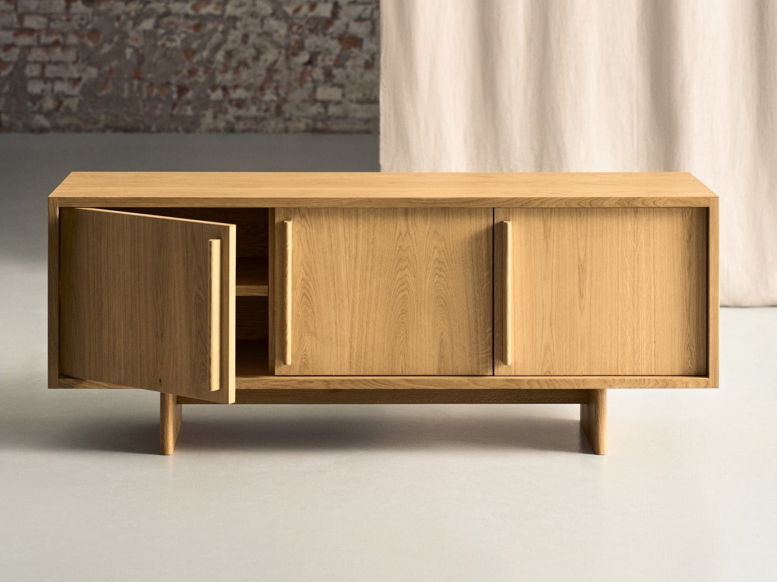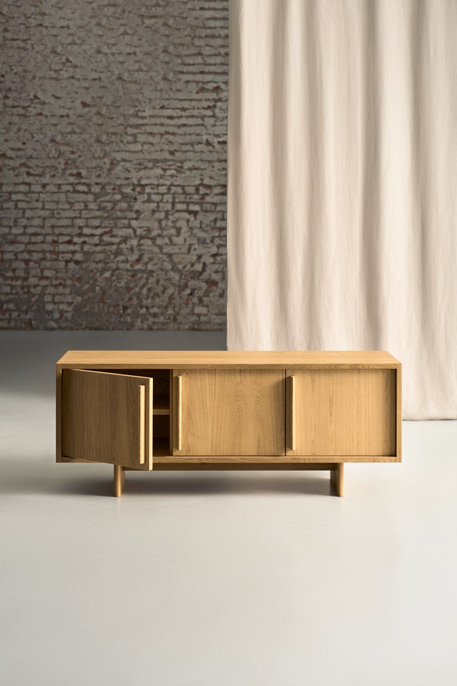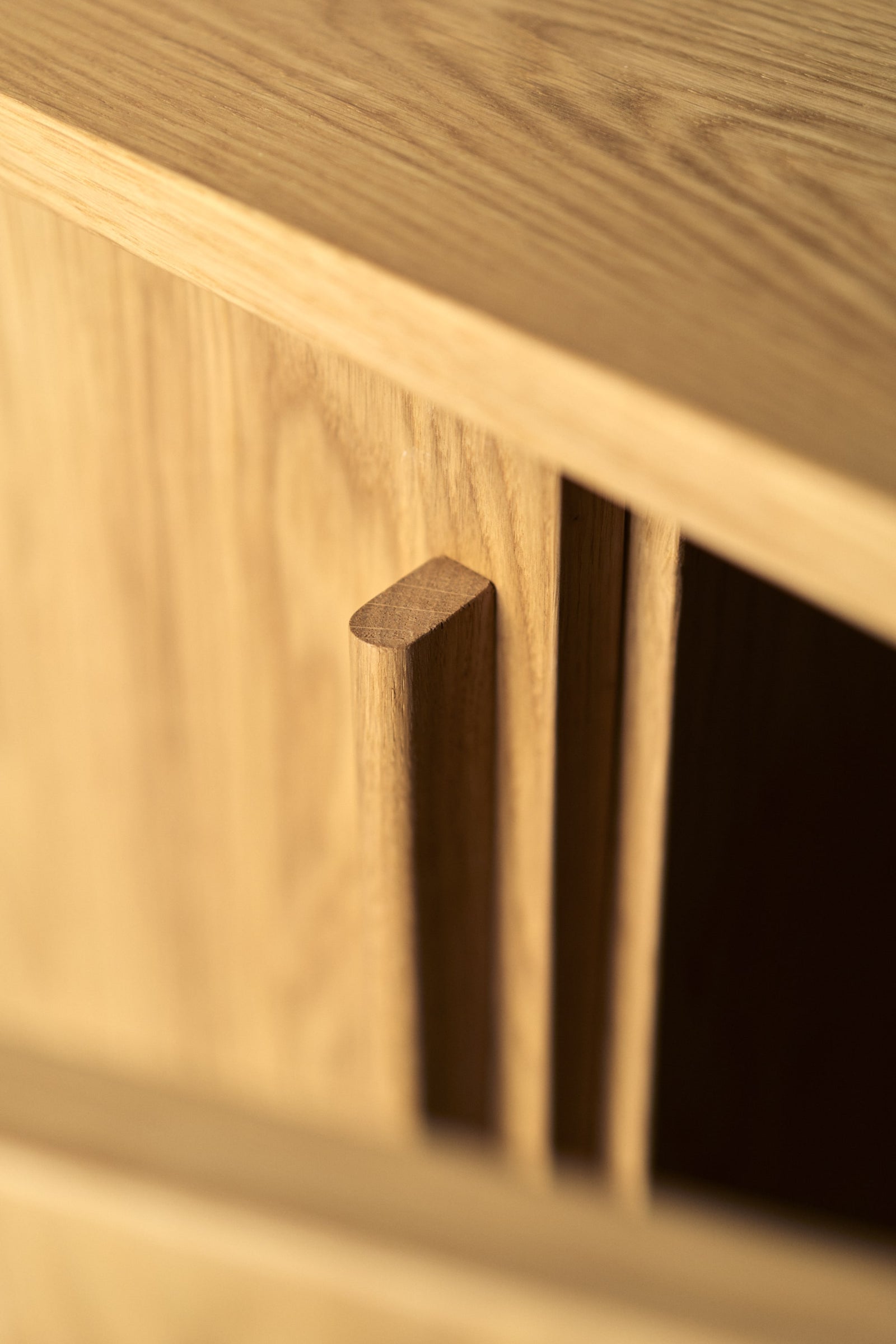 Making the most out of being a supporter. Our signature oak wood in a form of a cabinet for your TV setup or anything that you envision really. Stor’s sturdy structure makes planning its destined use a lot easier. Three storage units with a shelf inside each provide a great amount of possibilities to organise different categories of stuff. You can fill them up right away or leave empty as a backup space. Fully up to you. The oblong handles, which are flattened on sides making it more convenient to grasp, are placed in an irregular way to add a bit more depth to the overall layout of Stor. The entire cabinet is set on a massive base higher above the ground, so that your space doesn’t get this overwhelming or cluttered feeling. Anything just to align with your visions. Let Stor support them.
