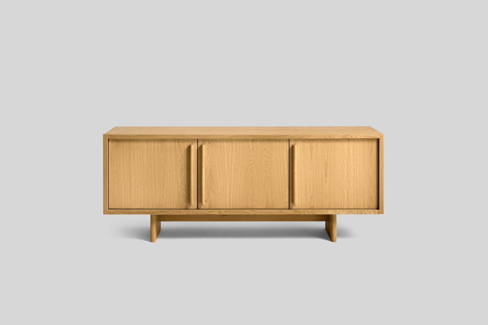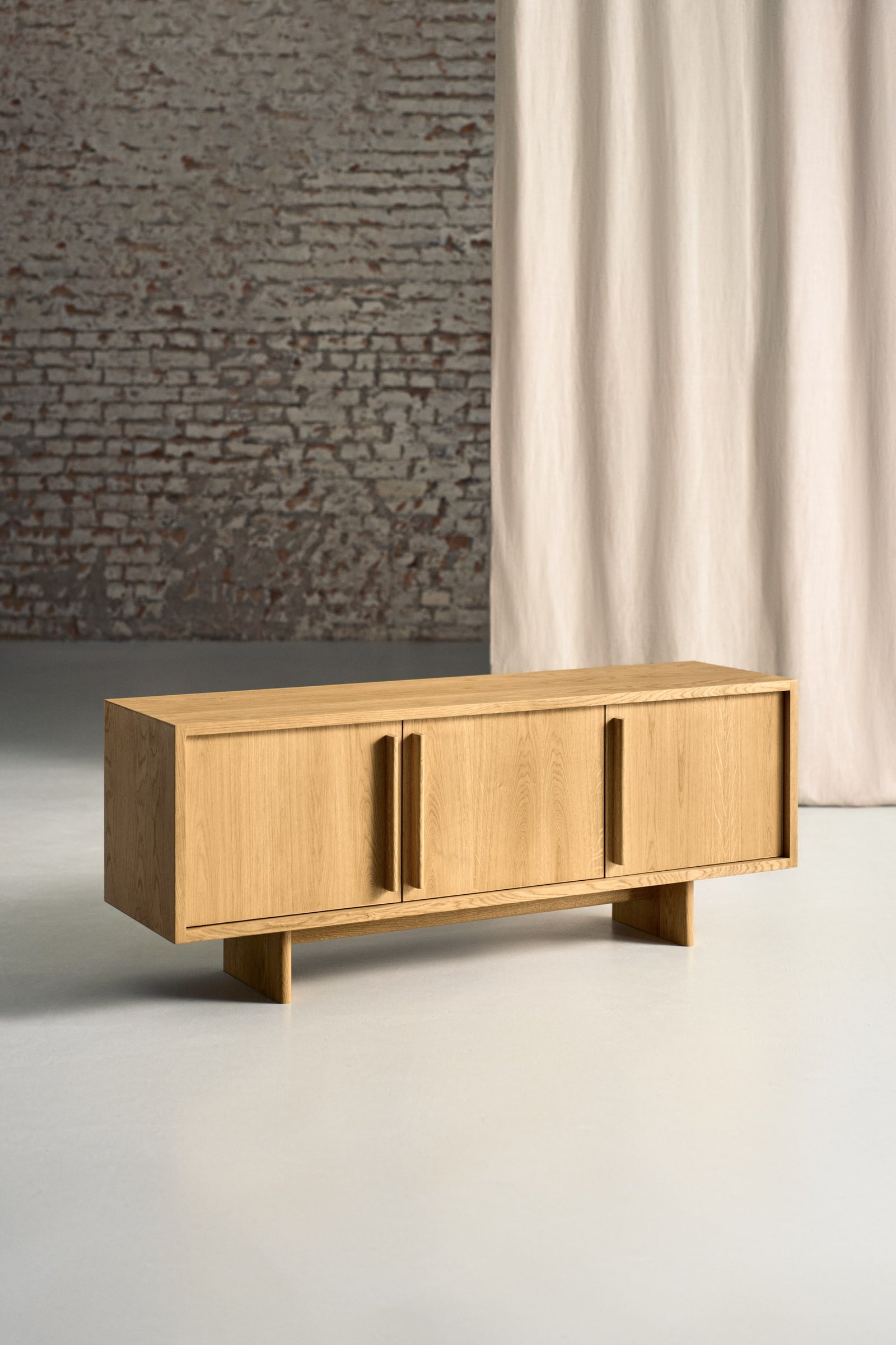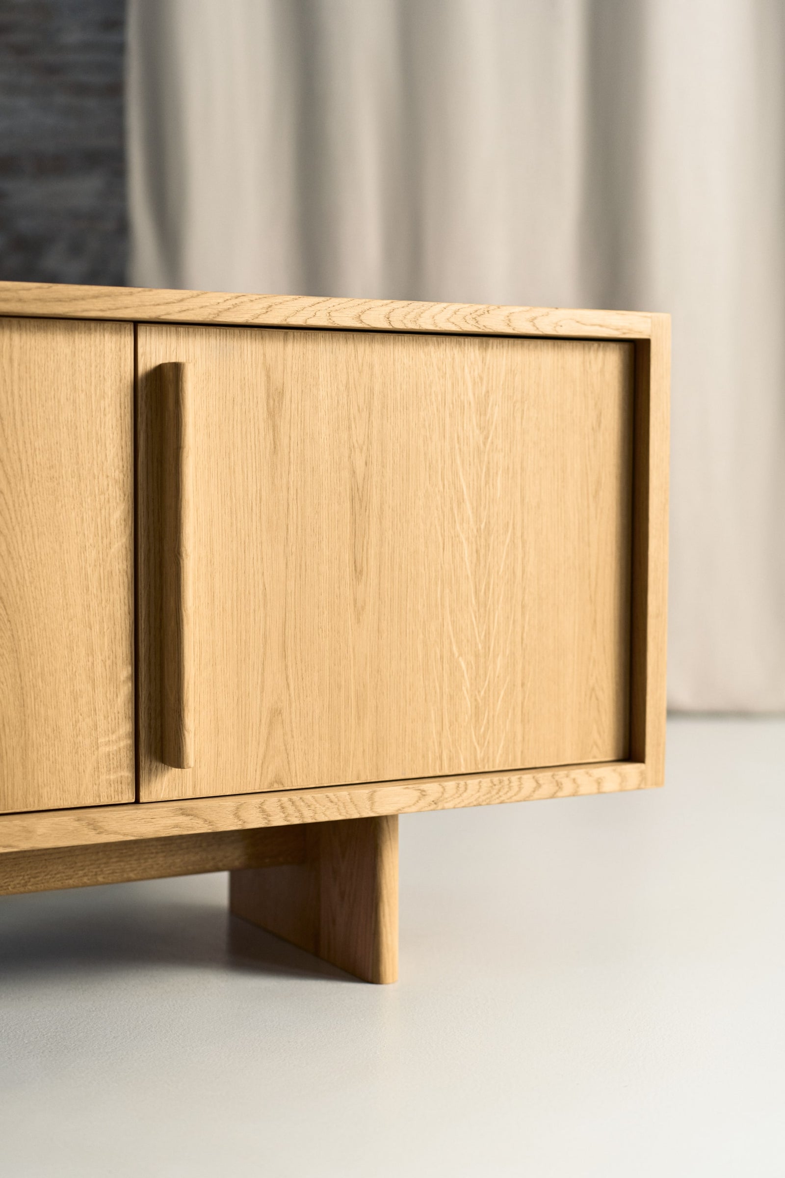 Making the most out of being a supporter. Our signature oak wood in a form of a cabinet for your TV setup or anything that you envision really. Stor’s sturdy structure makes planning its destined use a lot easier. Three storage units with a shelf inside each provide a great amount of possibilities to organise different categories of stuff. You can fill them up right away or leave empty as a backup space. Fully up to you. The oblong handles, which are flattened on sides making it more convenient to grasp, are placed in an irregular way to add a bit more depth to the overall layout of Stor. The entire cabinet is set on a massive base higher above the ground, so that your space doesn’t get this overwhelming or cluttered feeling. Anything just to align with your visions. Let Stor support them.