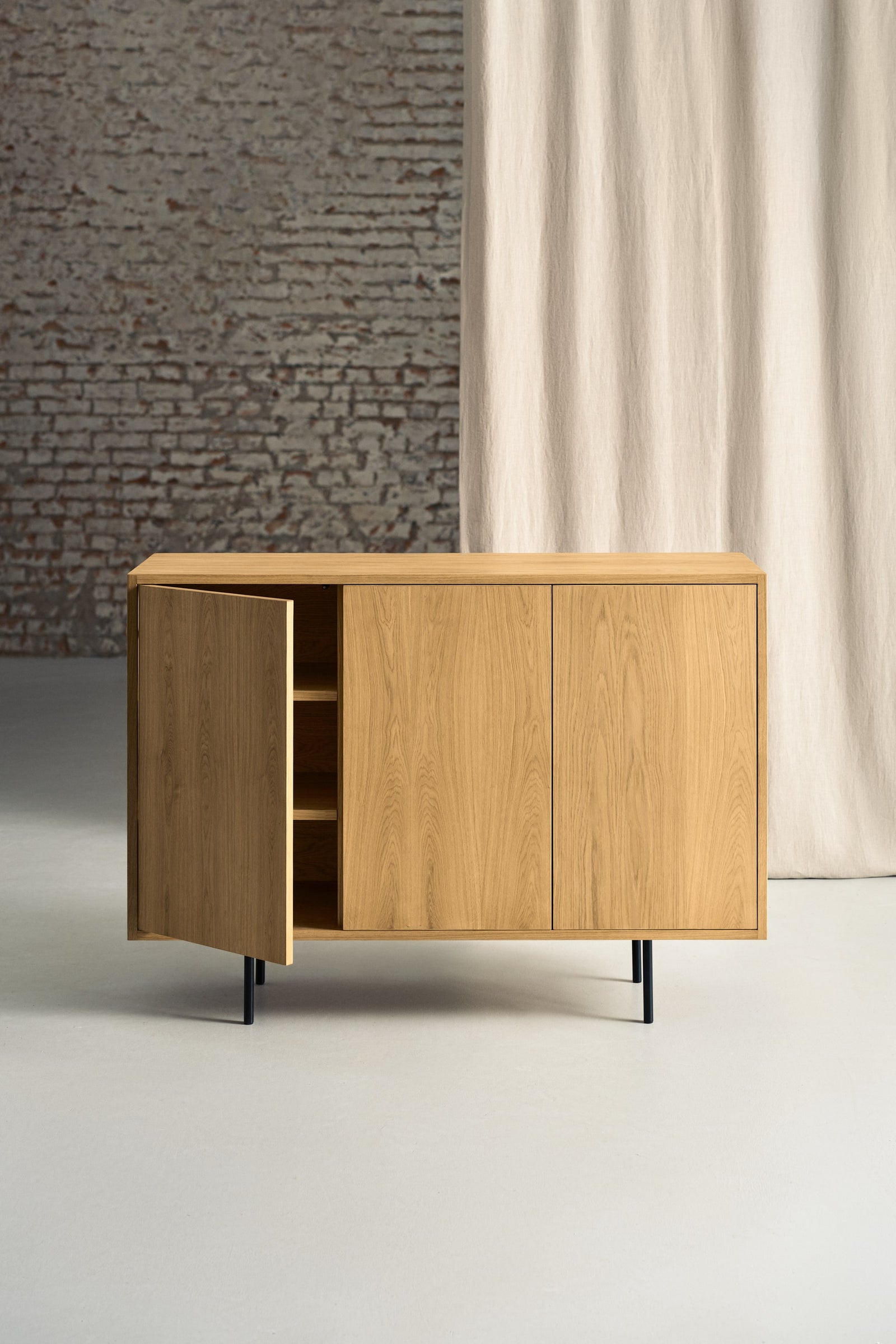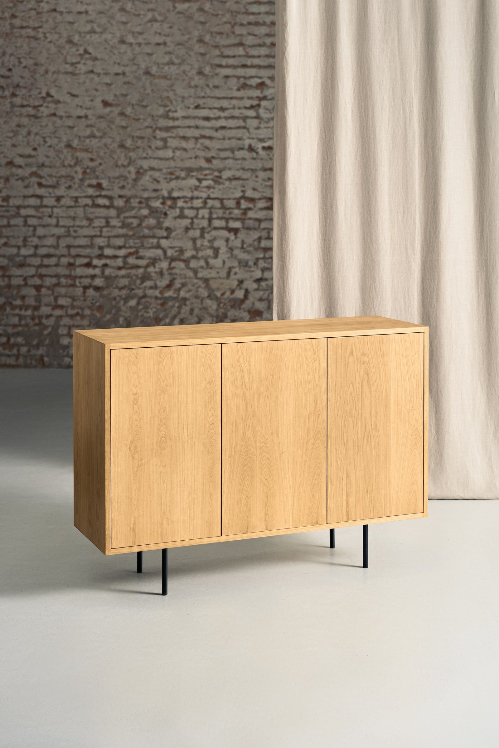 Komoda Elma wykonana została z drewna dębowego. Dzięki swojemu uniwersalnemu charakterowi, komoda znajdzie swoje zastosowanie zarówno w przestrzeni dziennej, jak i tej sypialnej. Minimalizm to jedna z naszych wartości wiodących. W imię potwierdzenia tej idei opracowaliśmy system automatycznego otwierania szafek na dotyk, dzięki czemu cała forma pozostaje niczym niezmącona, a powierzchnia drewna hipnotyzuje niepowtarzalnym ułożeniem słojów drewna. Organizacja i porządek ponad wszystko - półki wewnątrz gwarantują spore możliwości przechowywania. Metalowe nogi w kolorze głębokiej czerni dodają przestrzeni powietrza i optycznie ją zwiększają.