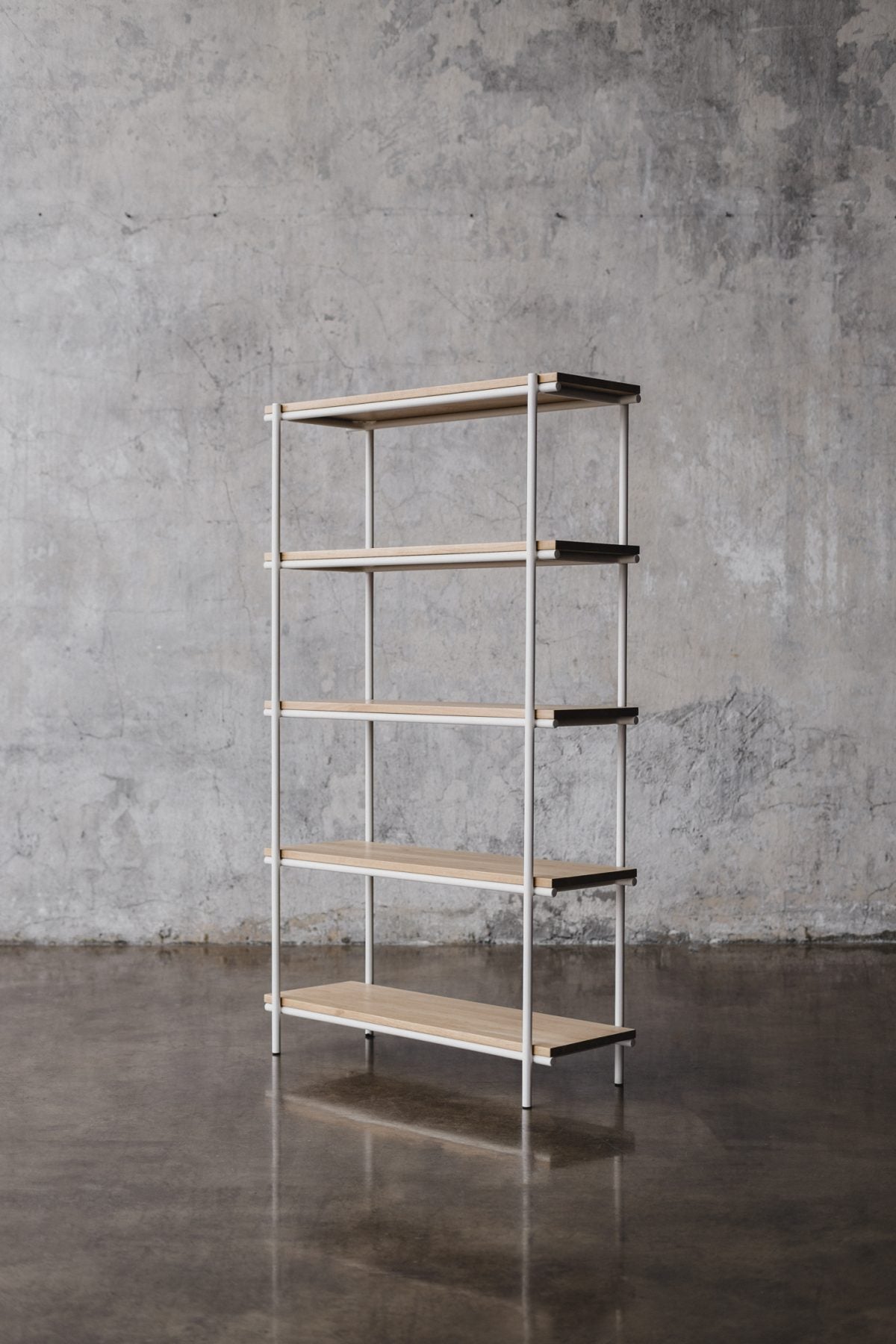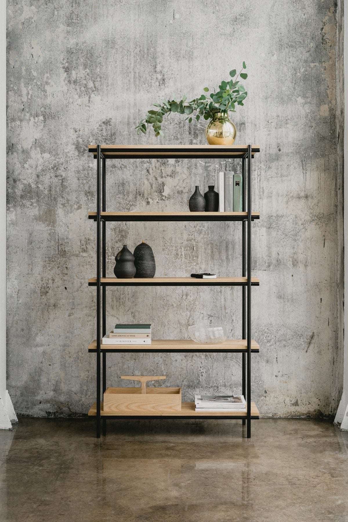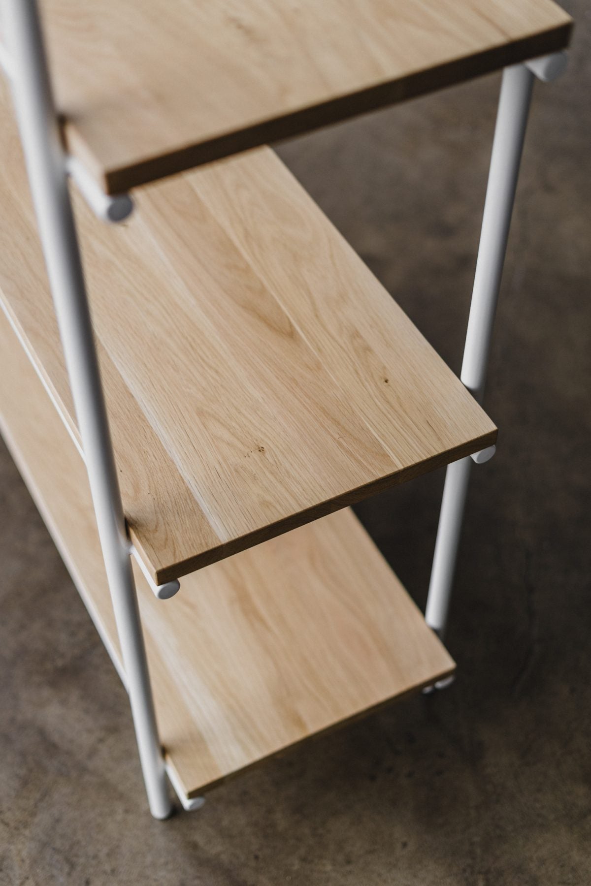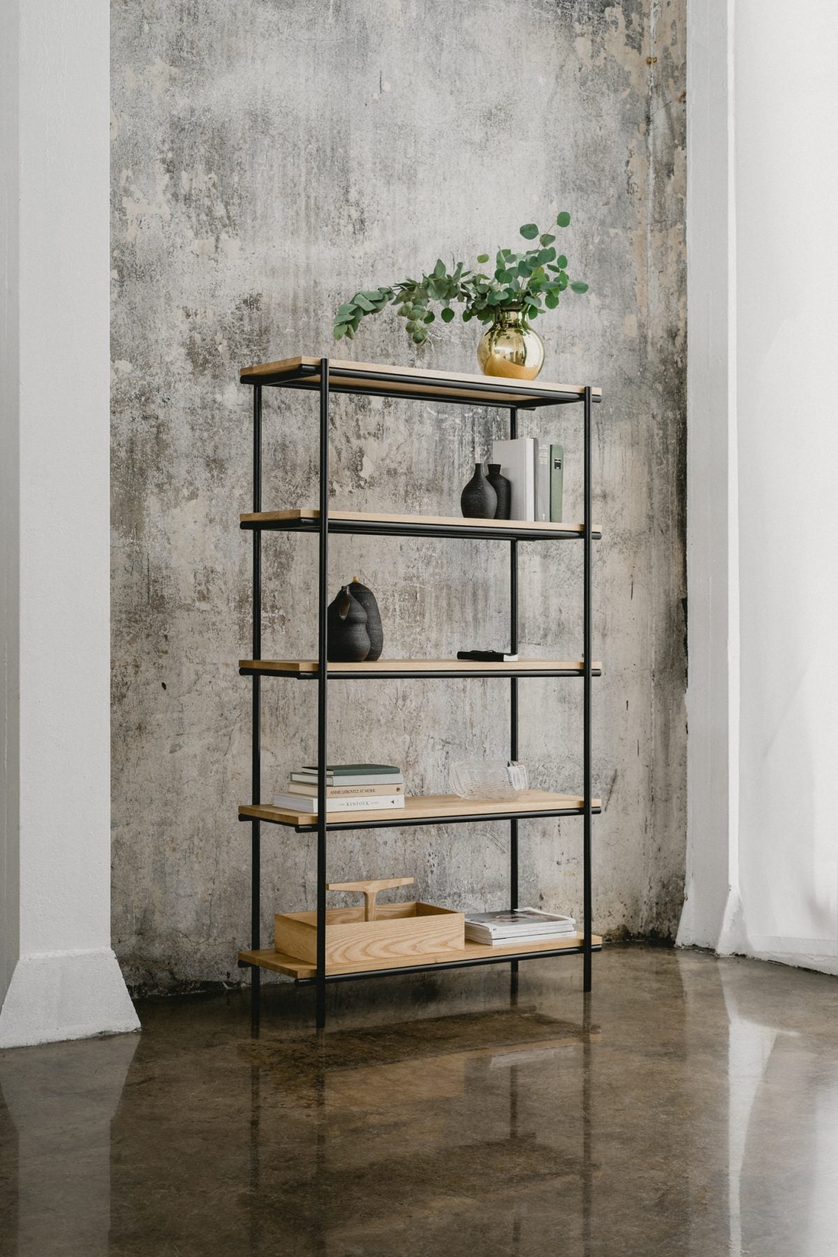 Prosta, metalowa konstrukcja w połączeniu z drewnianymi półkami z litego dębu nadają regałowi lekki wyraz zapewniając jednocześnie wysoką funkcjonalność.