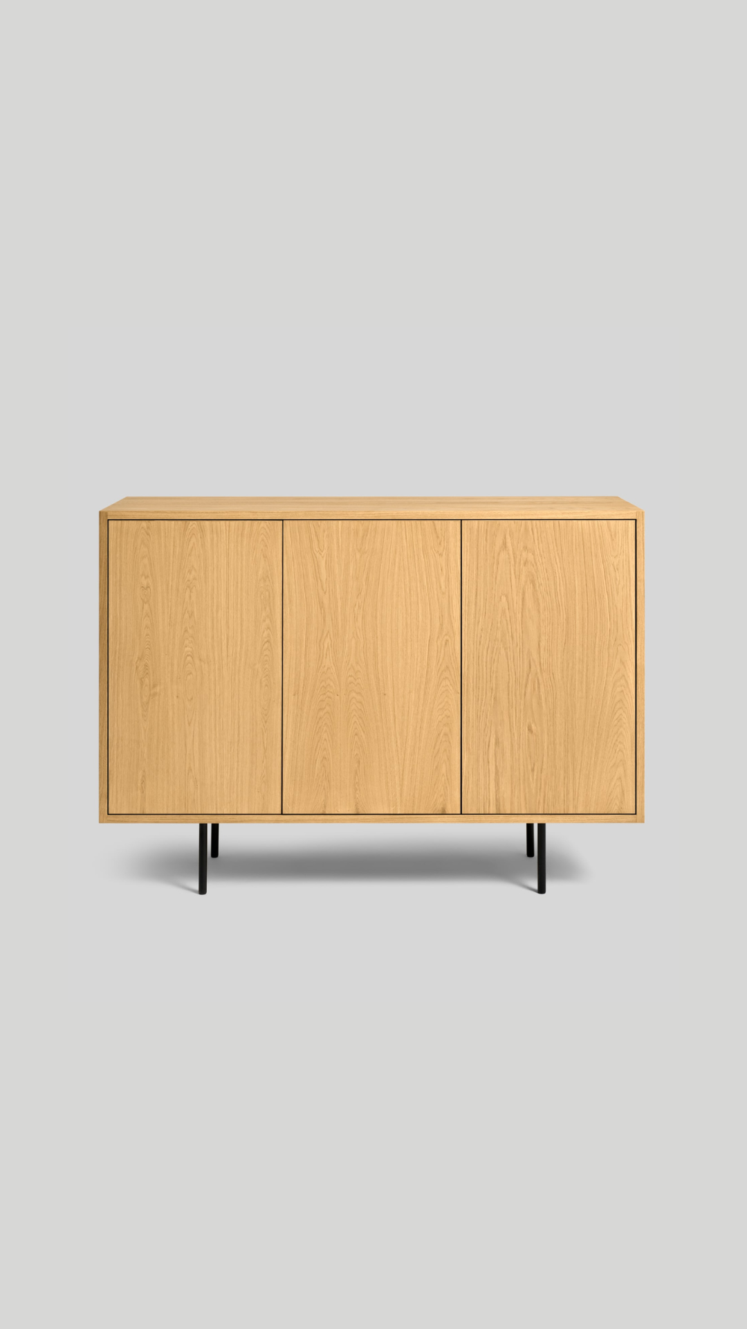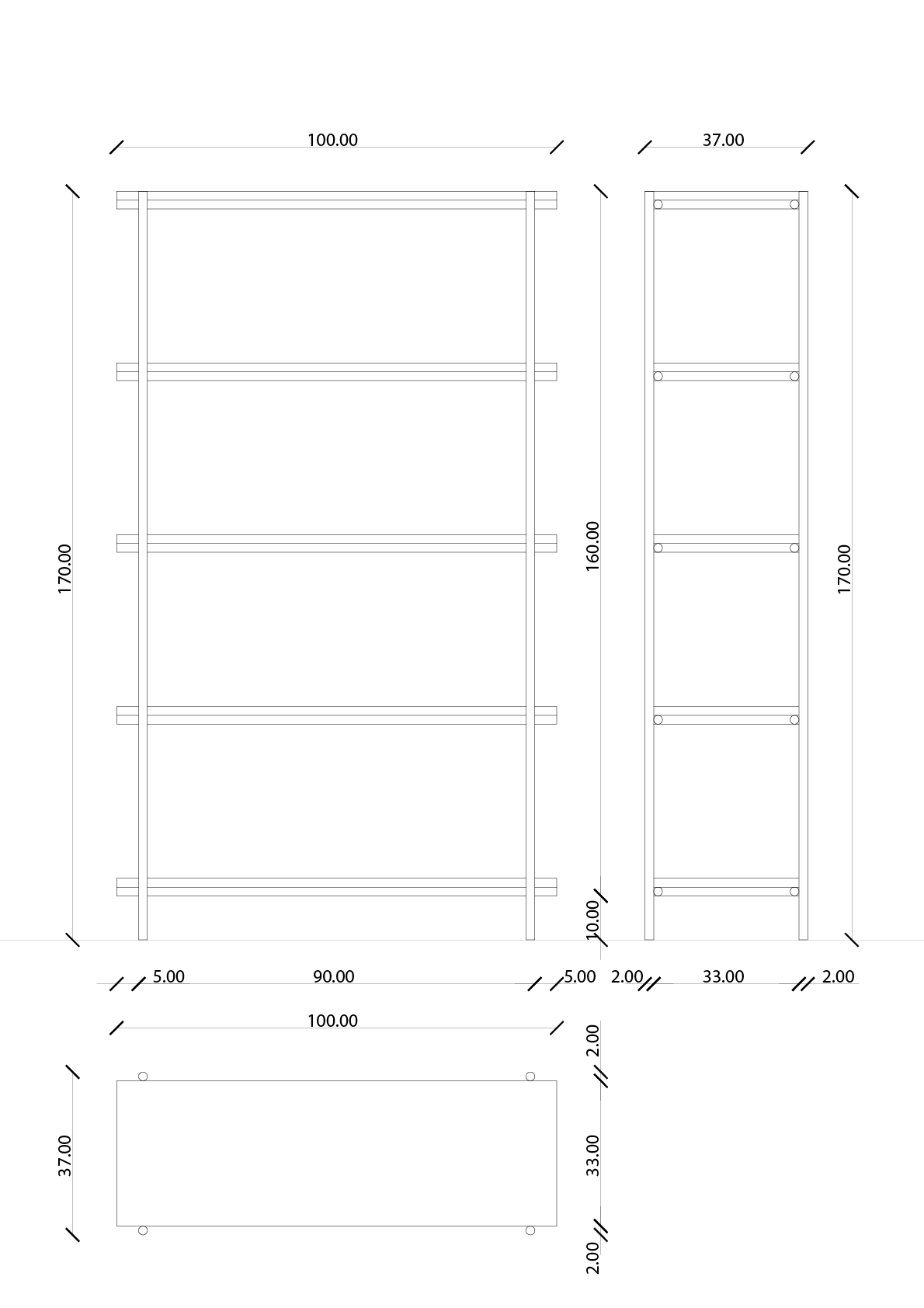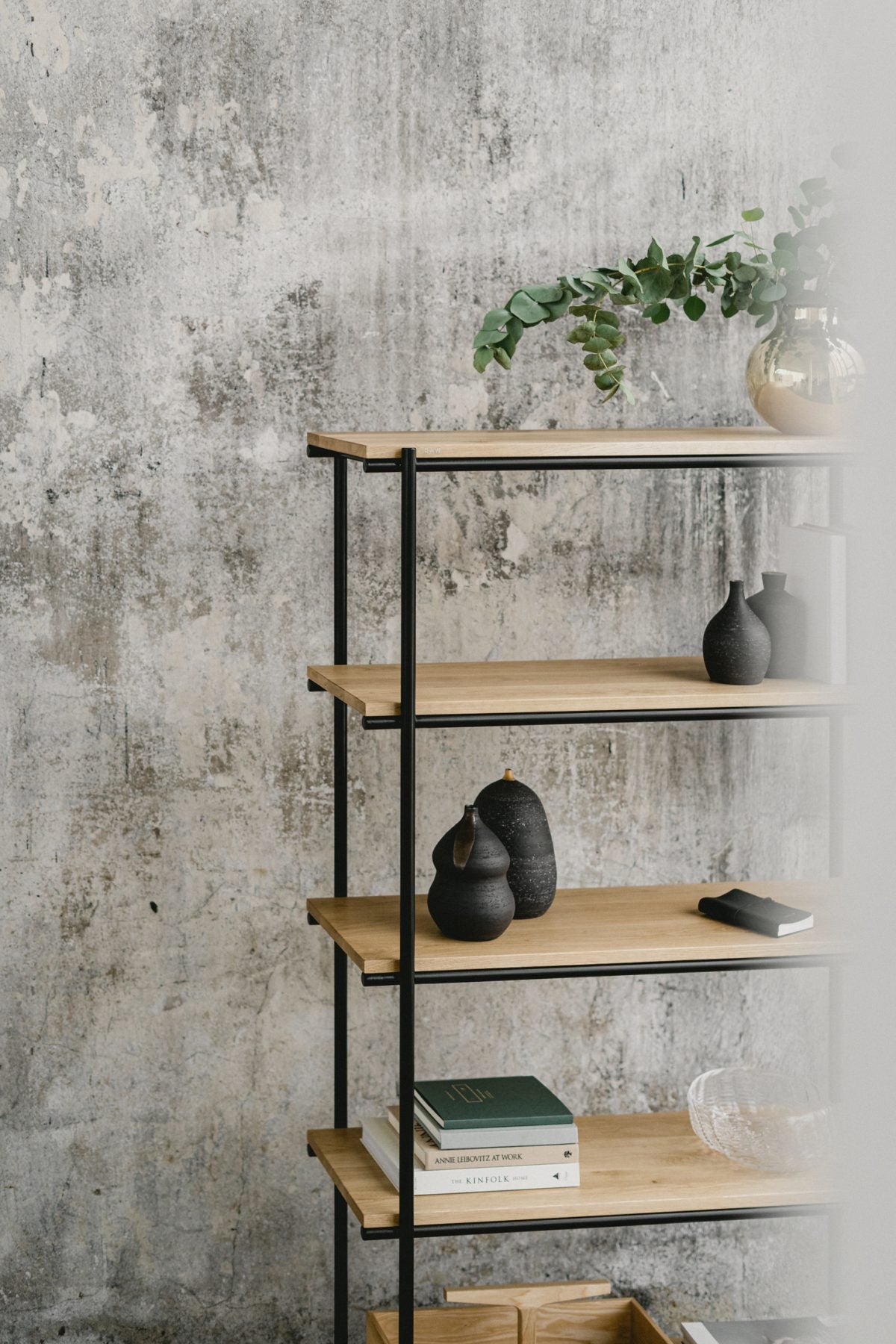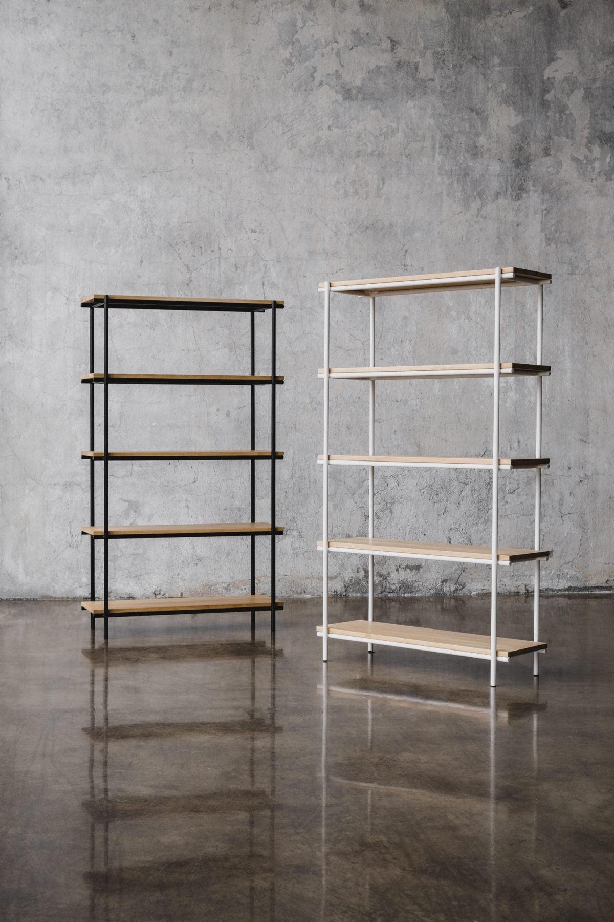 Prosta, metalowa konstrukcja w połączeniu z drewnianymi półkami z litego dębu nadają regałowi lekki wyraz zapewniając jednocześnie wysoką funkcjonalność.