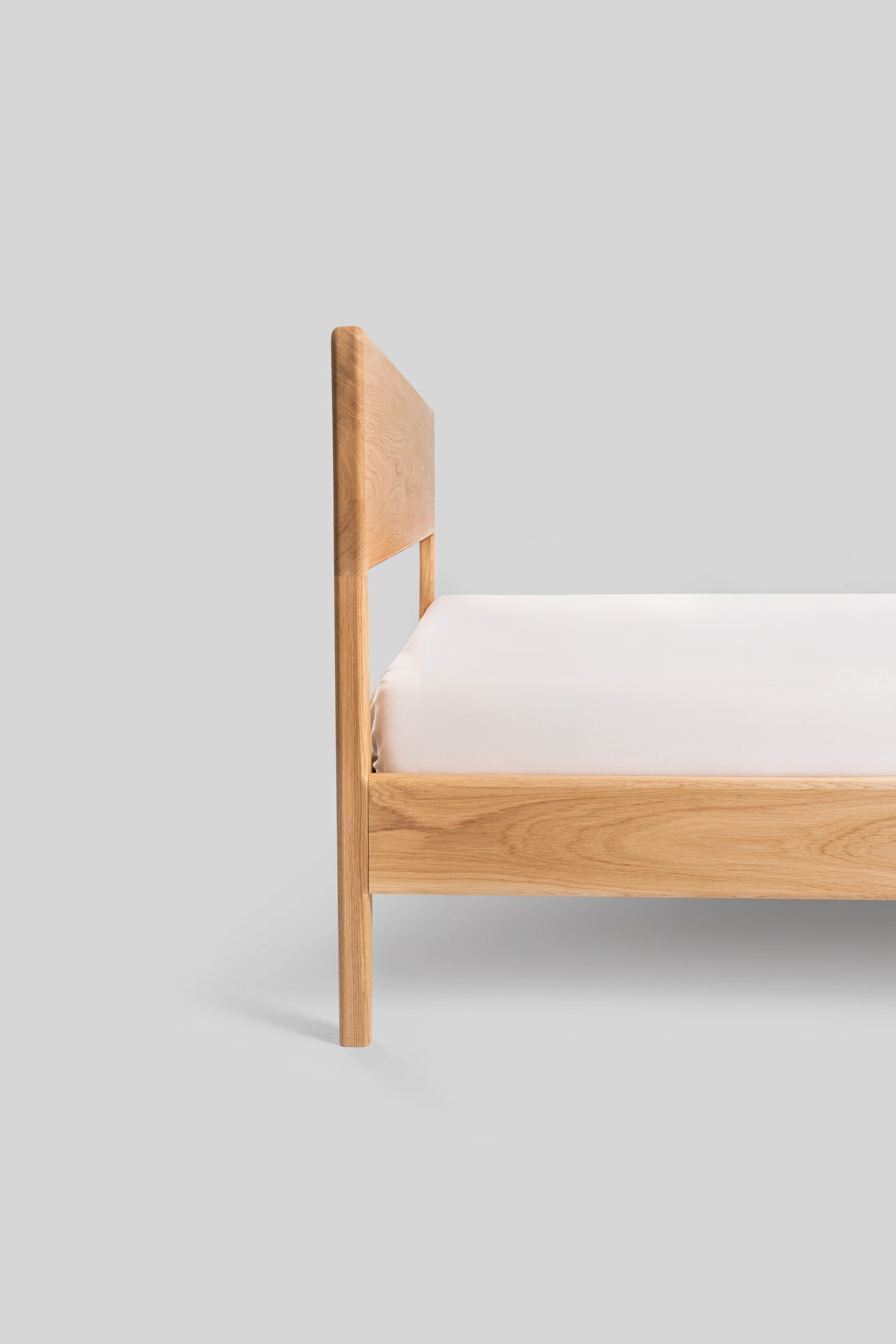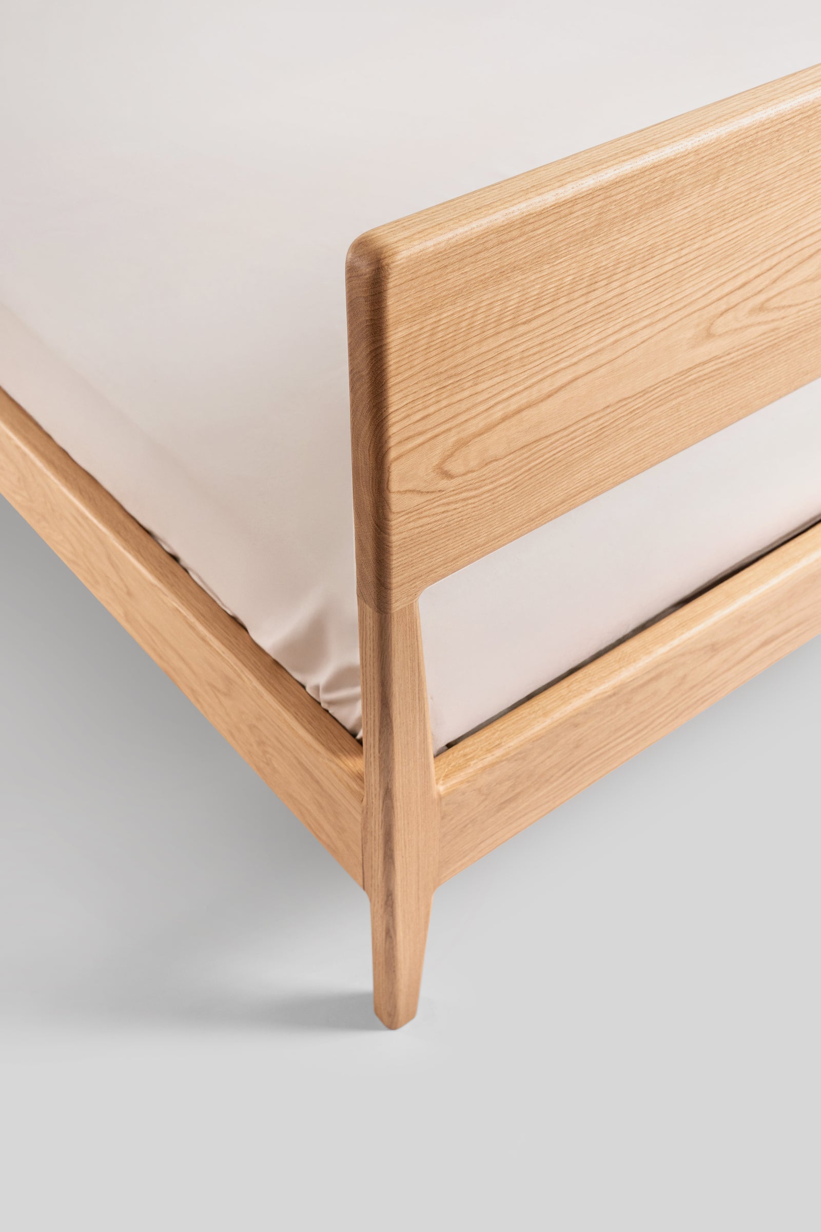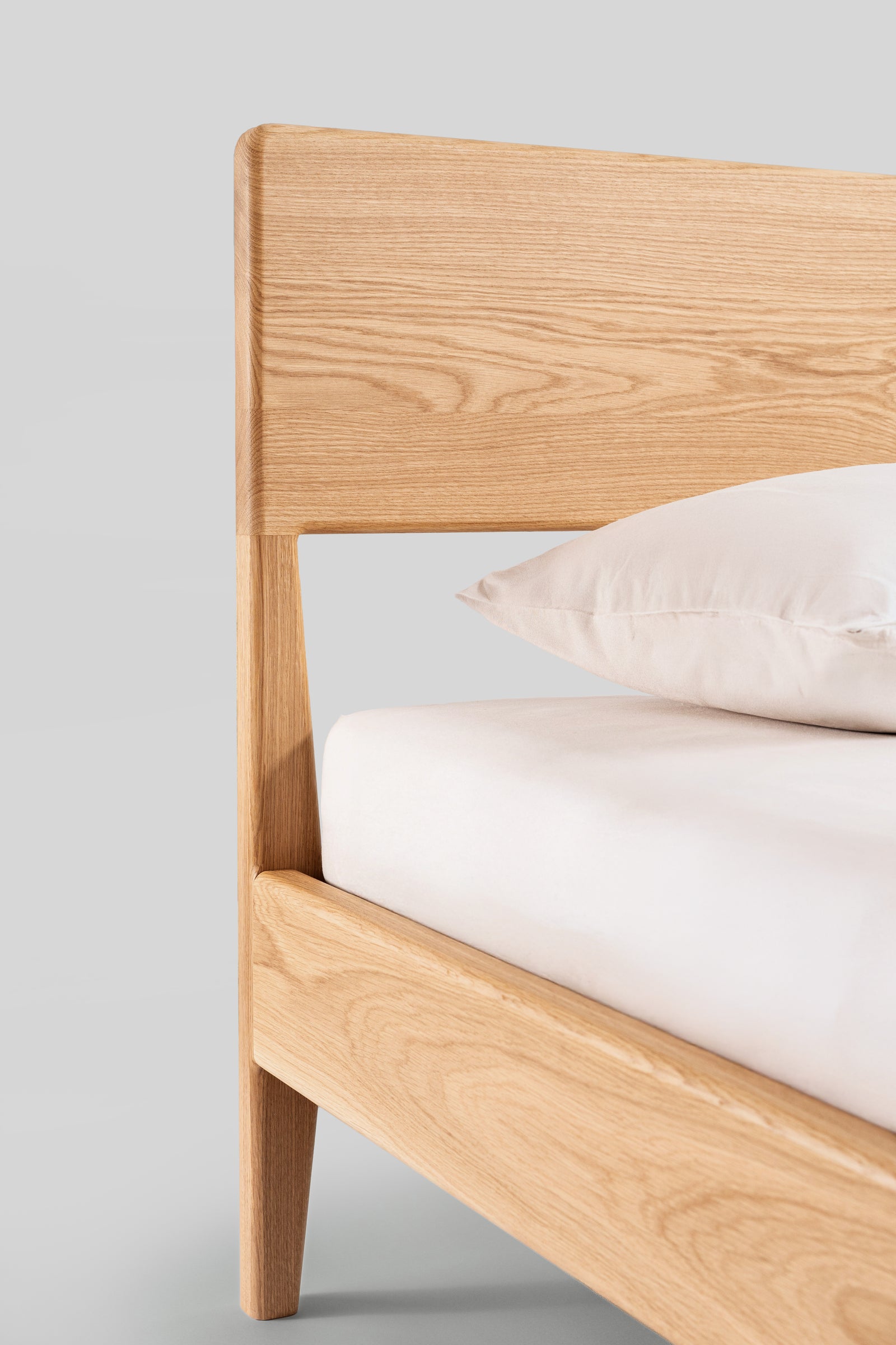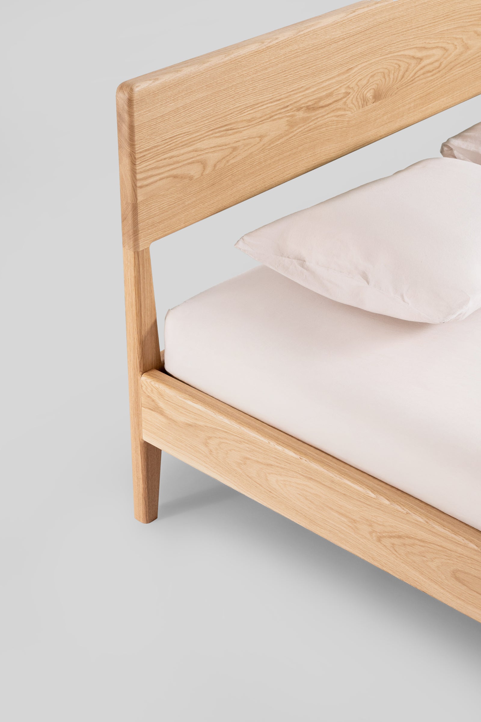 Łóżko Rumi to połączenie lekkości formy i naturalnego uroku litego dębu. Subtelnie zwężane nogi oraz delikatne zaoblenia krawędzi nadają konstrukcji elegancki, ponadczasowy charakter. Zagłówek z litego dębu tworzy solidne i wygodne oparcie, a jego prosta forma podkreśla szlachetny rysunek drewna.