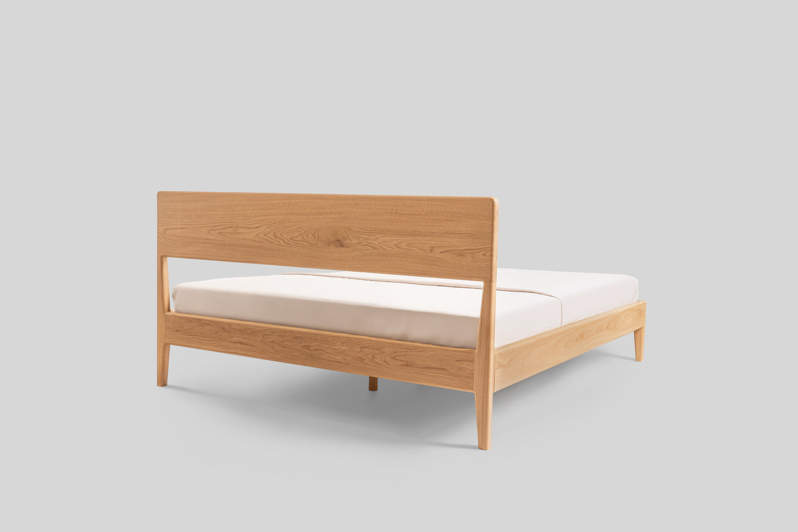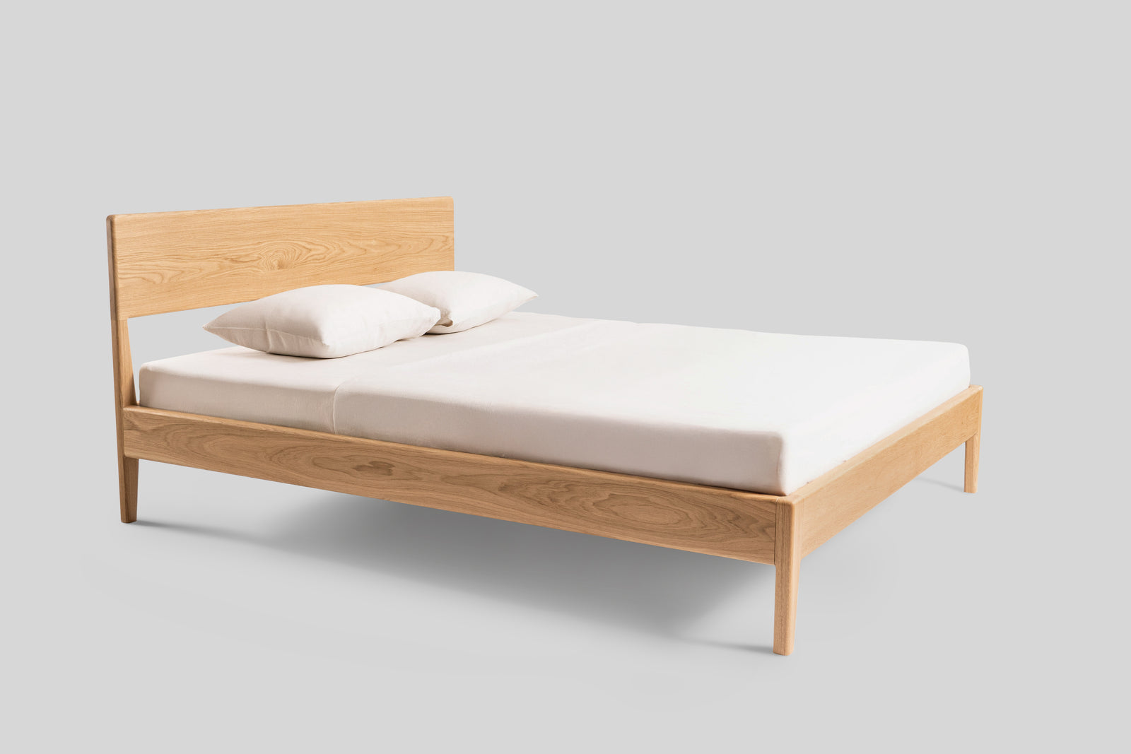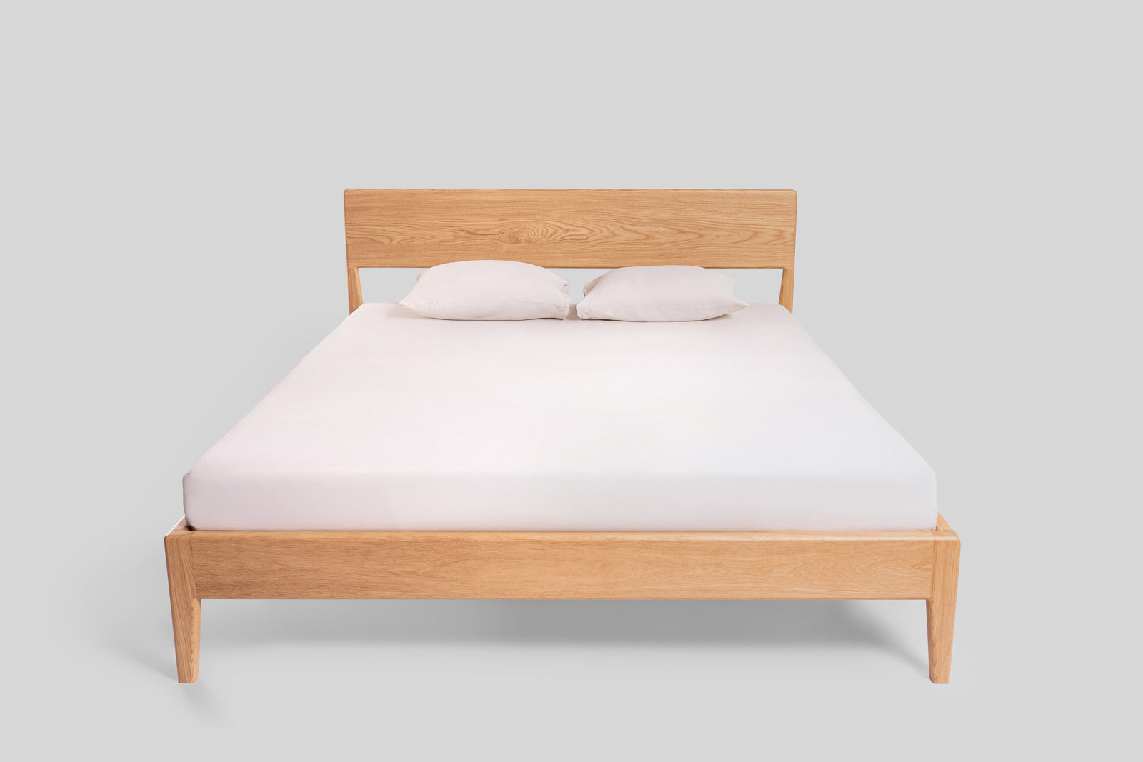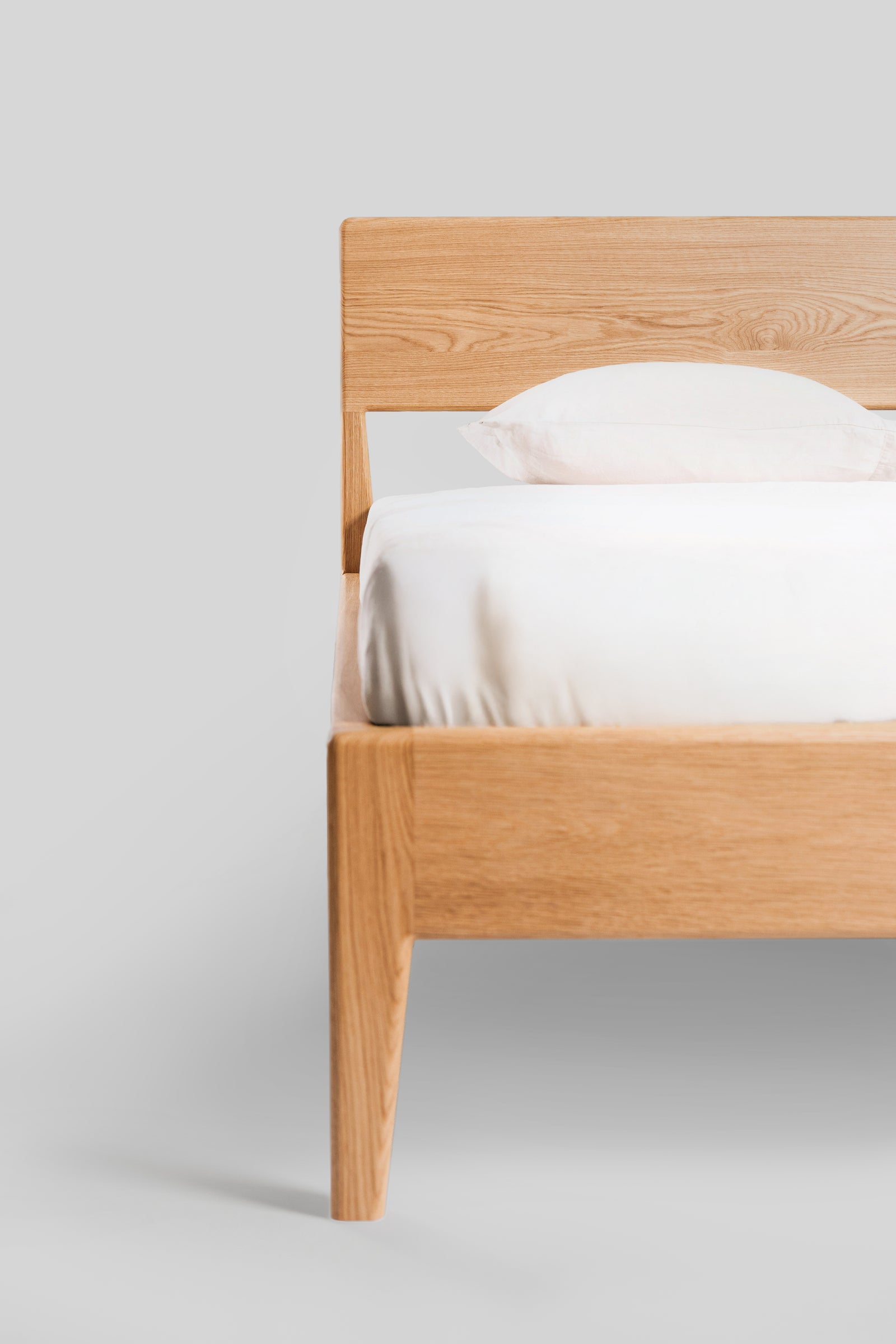 Łóżko Rumi to połączenie lekkości formy i naturalnego uroku litego dębu. Subtelnie zwężane nogi oraz delikatne zaoblenia krawędzi nadają konstrukcji elegancki, ponadczasowy charakter. Zagłówek z litego dębu tworzy solidne i wygodne oparcie, a jego prosta forma podkreśla szlachetny rysunek drewna.